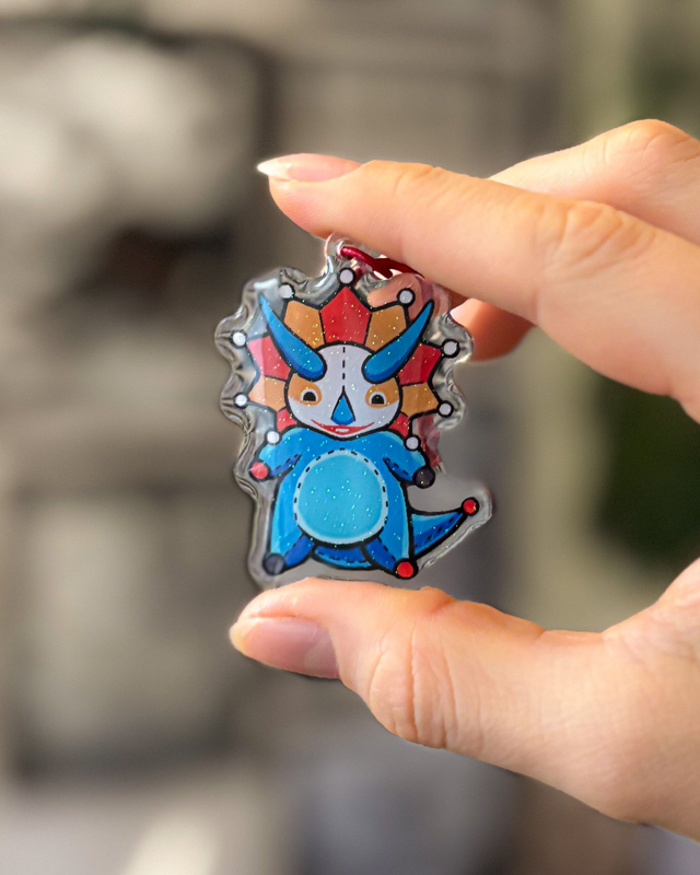 Brelok akrylowy z powłoką z żywicy i brokatem.