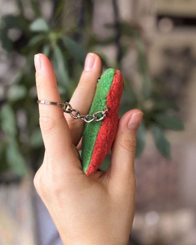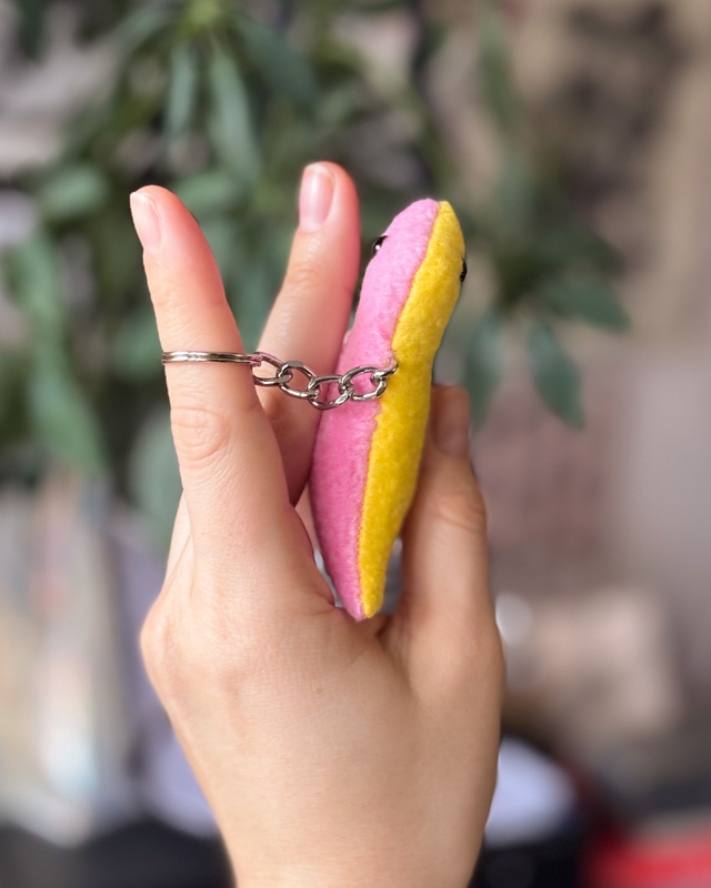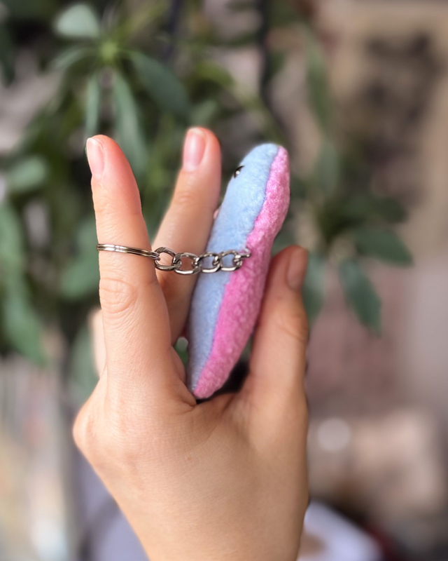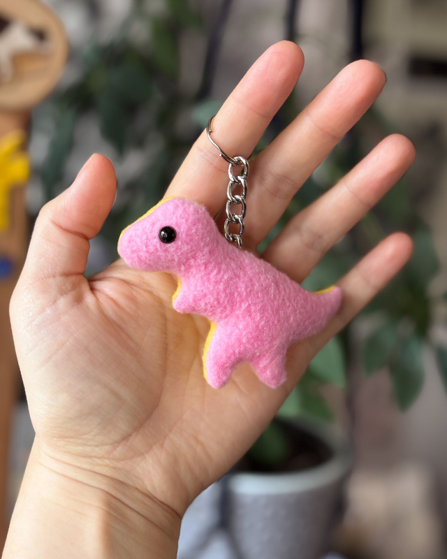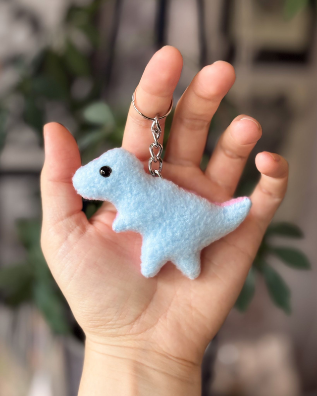 Dwukolorowy pluszowy breloczek w kształcie dinozaura.