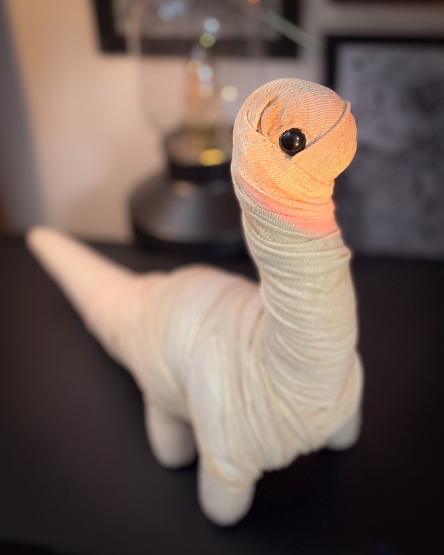 Autorska maskotka pluszowego diplodoka w stroju mumii. Pluszak typu designer toy, nie przeznaczony dla małych dzieci.