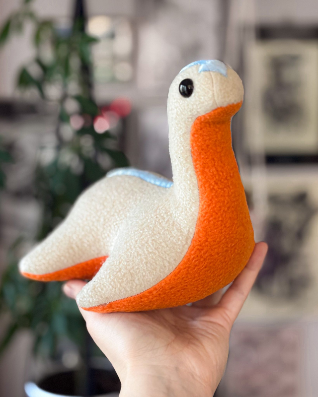 Pluszowy plezjozaur z błękitną strzałą od pyszczka aż po ogonek.