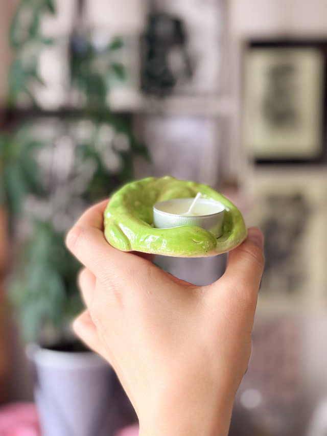 Świecznik na tealight w kształcie śpiącego dinozaura, ceramika szkliwiona. Można myć w zmywarce.